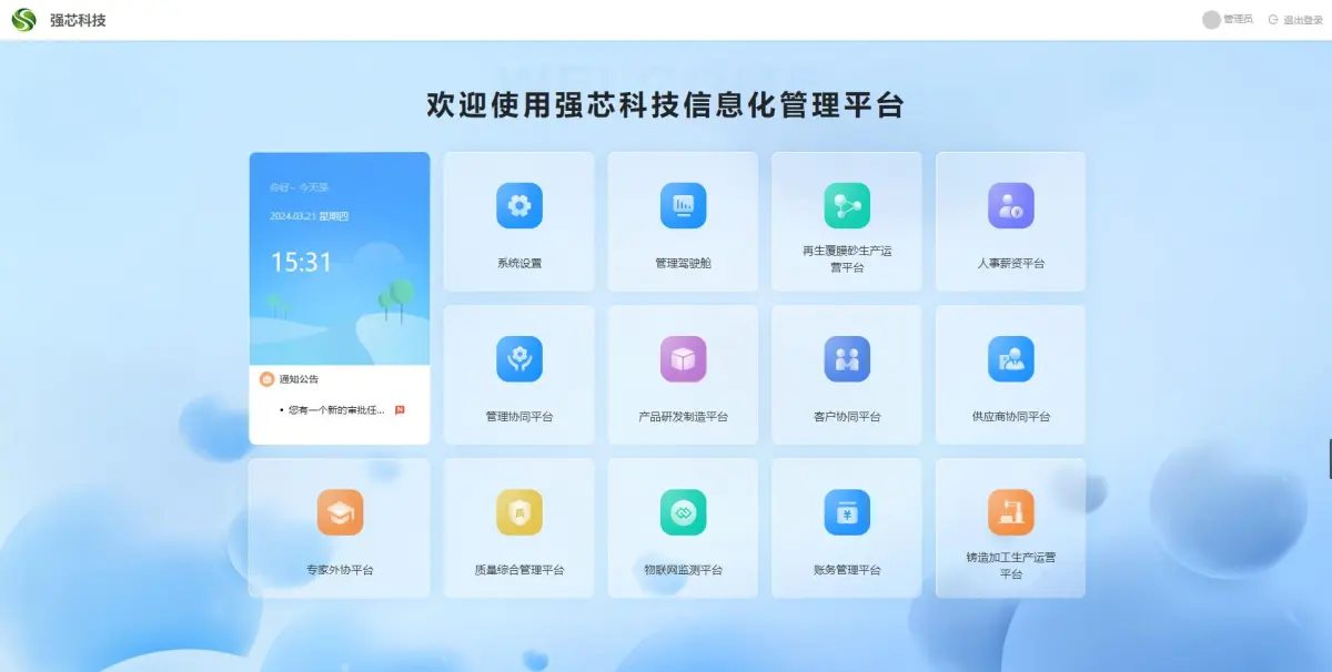 再生覆膜砂生產(chǎn)運營平臺:工作日志、銷售管理、倉庫管理、采購管理、車間工廠、工作流、消息中心